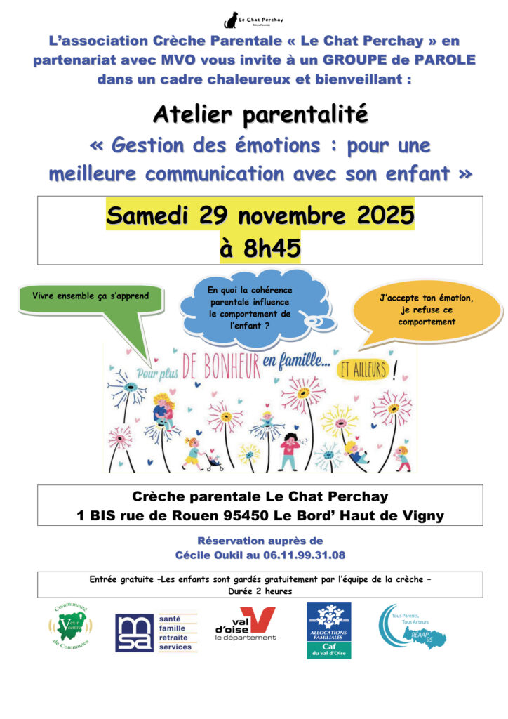 Accueillis avec bienveillance, tous les parents de la communauté de communes Vexin Centre (inscrits ou non à la crèche du Perchay) peuvent en toute sérénité échanger sur leurs expériences pendant que les enfants seront gardés gratuitement dans une salle annexe par l’équipe de la crèche “le Chat Perchay”.