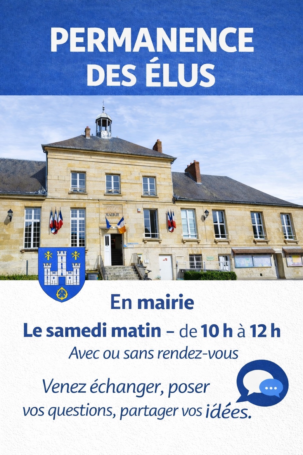 Tous les samedis matin, un élu sera présent de 10 heures à midi pour vous recevoir pour évoquer ensemble les sujets qui vous tiennent à coeur.